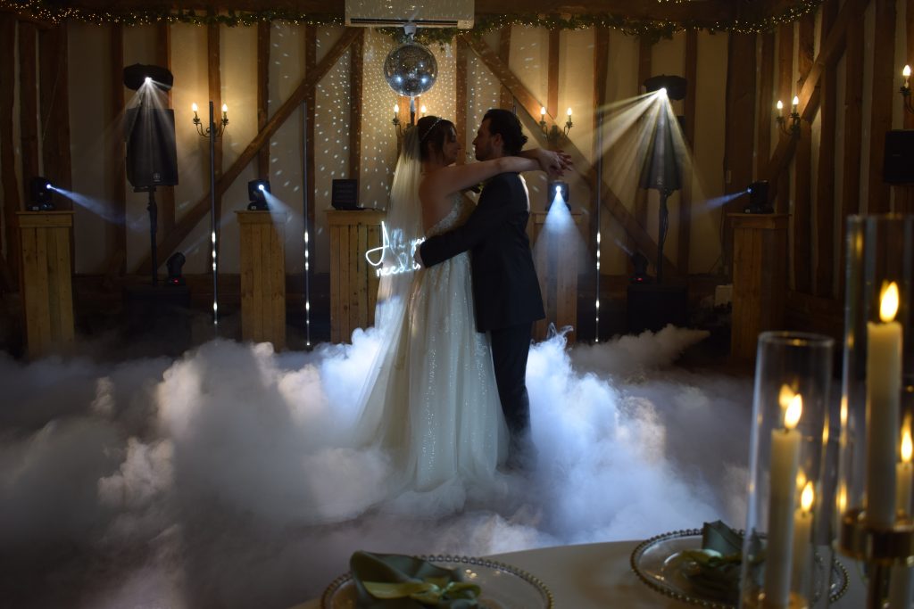 The first and most obvious one is confetti…and not just the hand-thrown variety! I use fully-loaded 1 metre confetti cannons to completely dazzle and surprise everyone. As with any pyrotechnic, it’s always essential to get the venue’s permission first. ‘Dancing On Clouds’ is probably the second-most requested effect we are asked about. The photo at the top of this page shows how beautiful it looks, a dense fog around the feet of the happy couple. Unlike a smoke or haze machine, dry ice doesn’t rise and won’t set off any fire alarms! It really looks classy, particularly when lit with just white light beams. A real Hollywood moment! I’m sure you’ve also seen the four feet tall L-O-V-E letters that some DJs and venues employ, lit up in bright white bulbs as a backdrop to the dance floor. These are incredibly popular, but please remember to turn them off as the night moves in otherwise we can’t darken the dance floor for a better atmosphere!